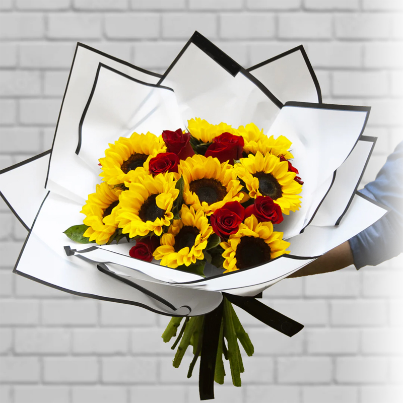 Cada girasol es seleccionado a mano por nuestros floristas para garantizar su frescura, tamaño y color vibrante. Acompañado de follaje verde y envuelto con un toque rústico o elegante (según tu elección), este arreglo es tan llamativo como significativo.